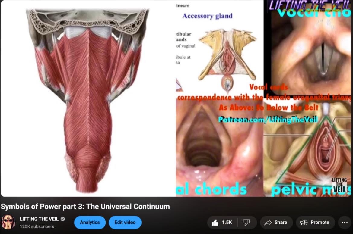 What others often show is only a fragment, connecting the vulva to the vocal cords. But my original work demonstrated that the true correspondence extends from the trachea itself, which mirrors the female urogenital triangle.
